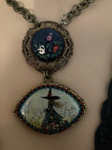 I call this one "The Witch of Blackbird Pond" after a beloved book. The image is hand beaded and paired with a vintage hand painted button. Definitely one you can wear all year round to celebrate the little bit of witch in all of us.