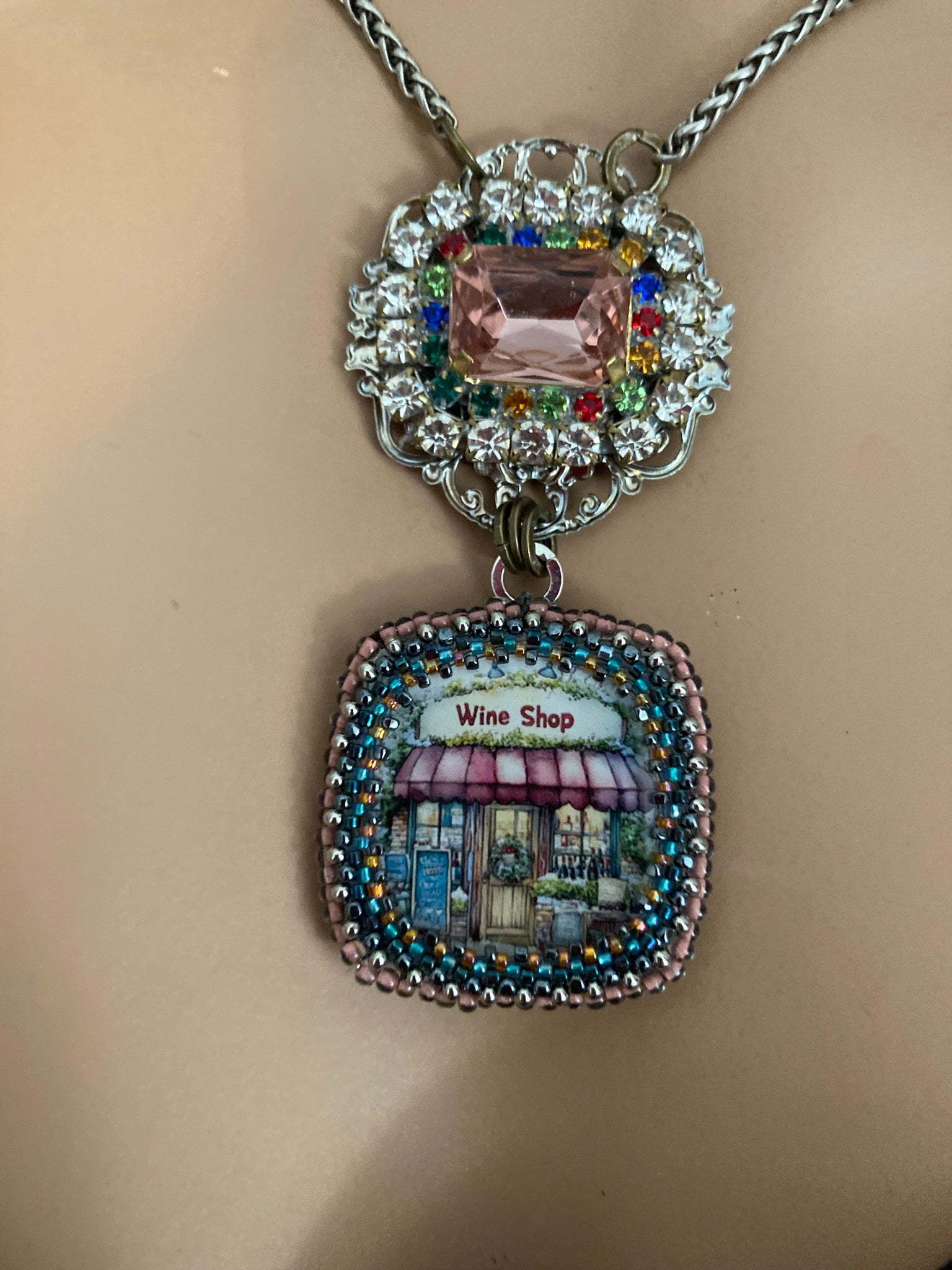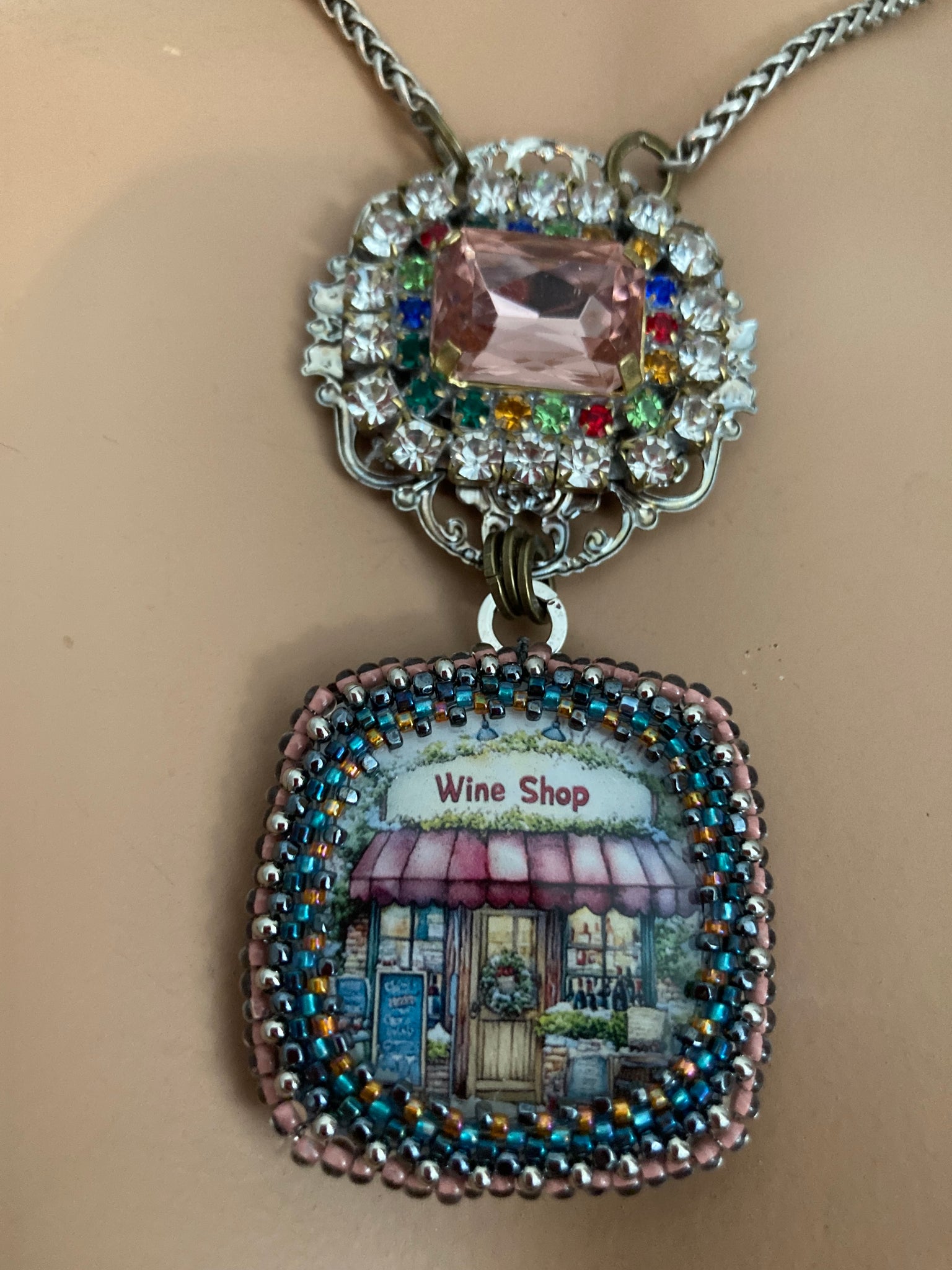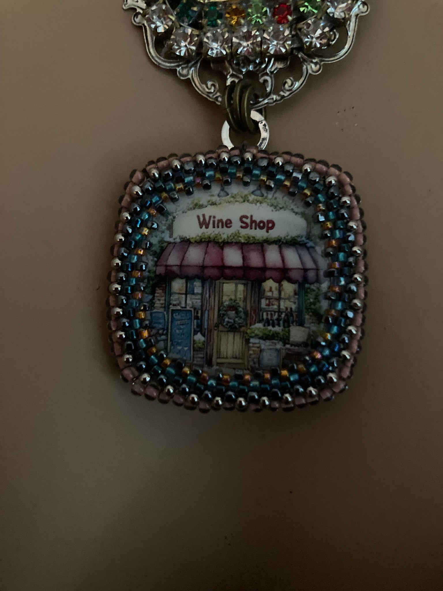 Lovely hand beaded wine shop image to celebrate your favorite wine bar. The 1.34” X 1.34” image is paired with vintage Czech glass. The pendant is suspended from a 16” antiqued silver chain with a 3” extender.