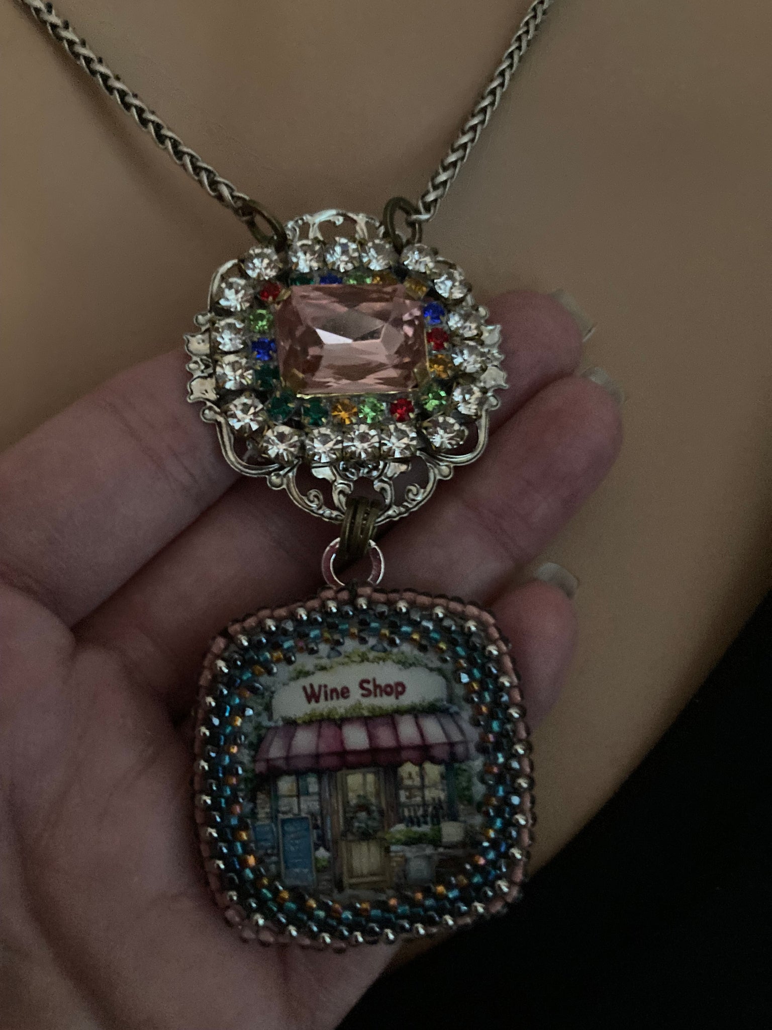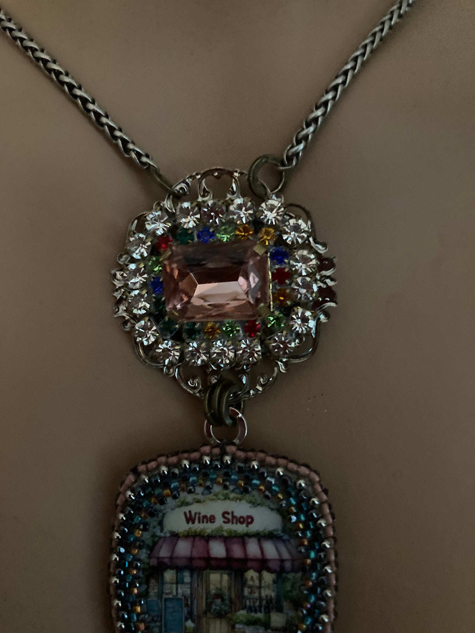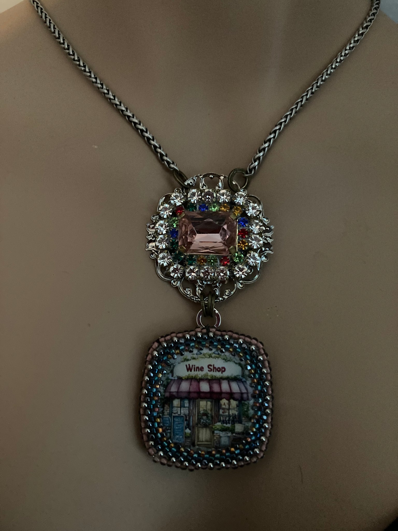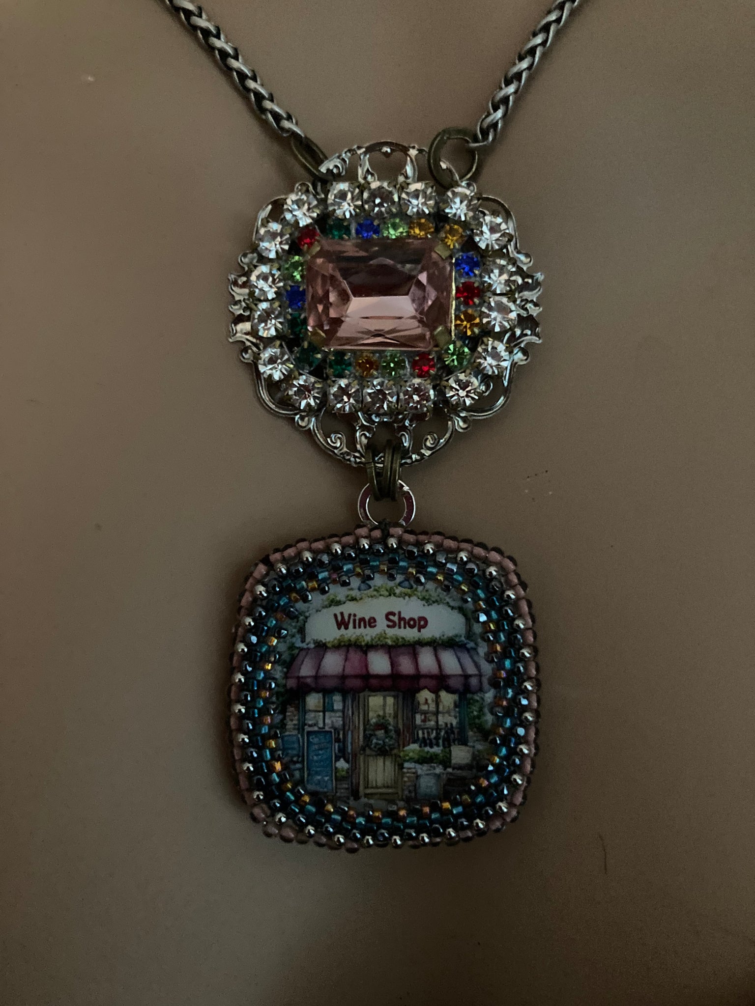 Lovely hand beaded wine shop image to celebrate your favorite wine bar. The 1.34” X 1.34” image is paired with vintage Czech glass. The pendant is suspended from a 16” antiqued silver chain with a 3” extender.