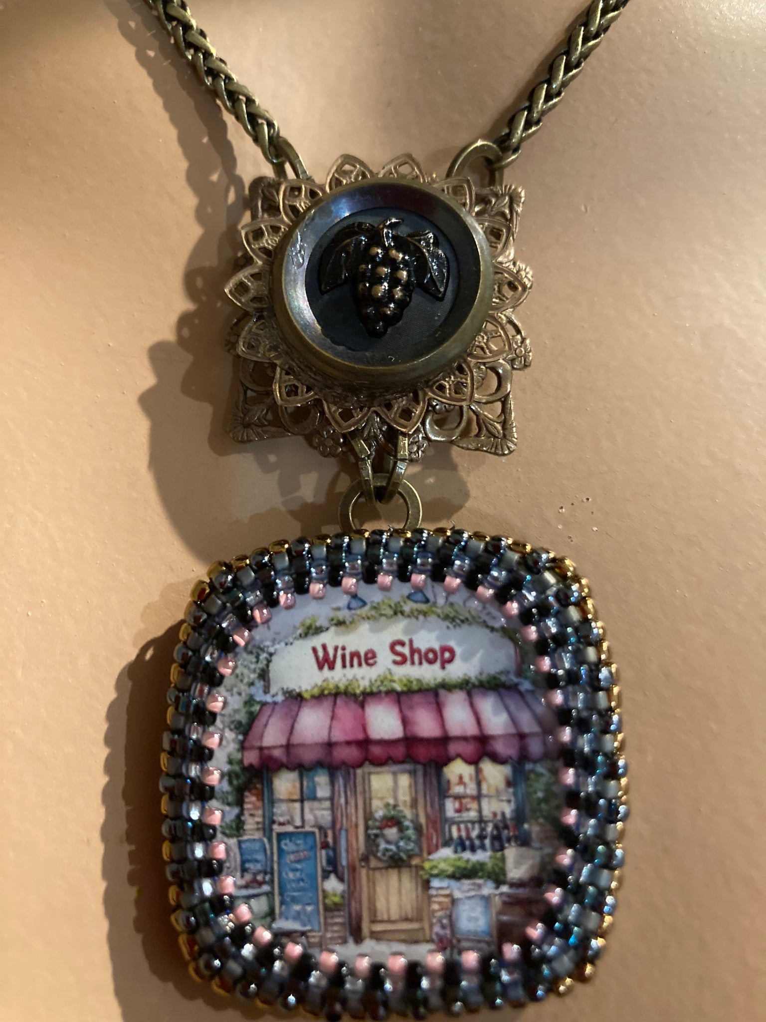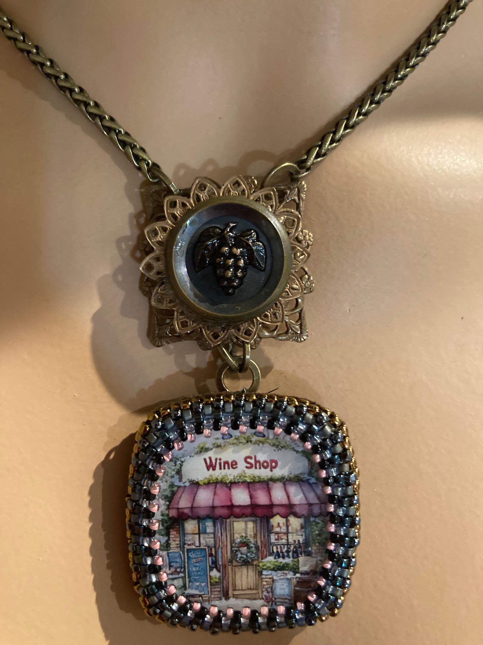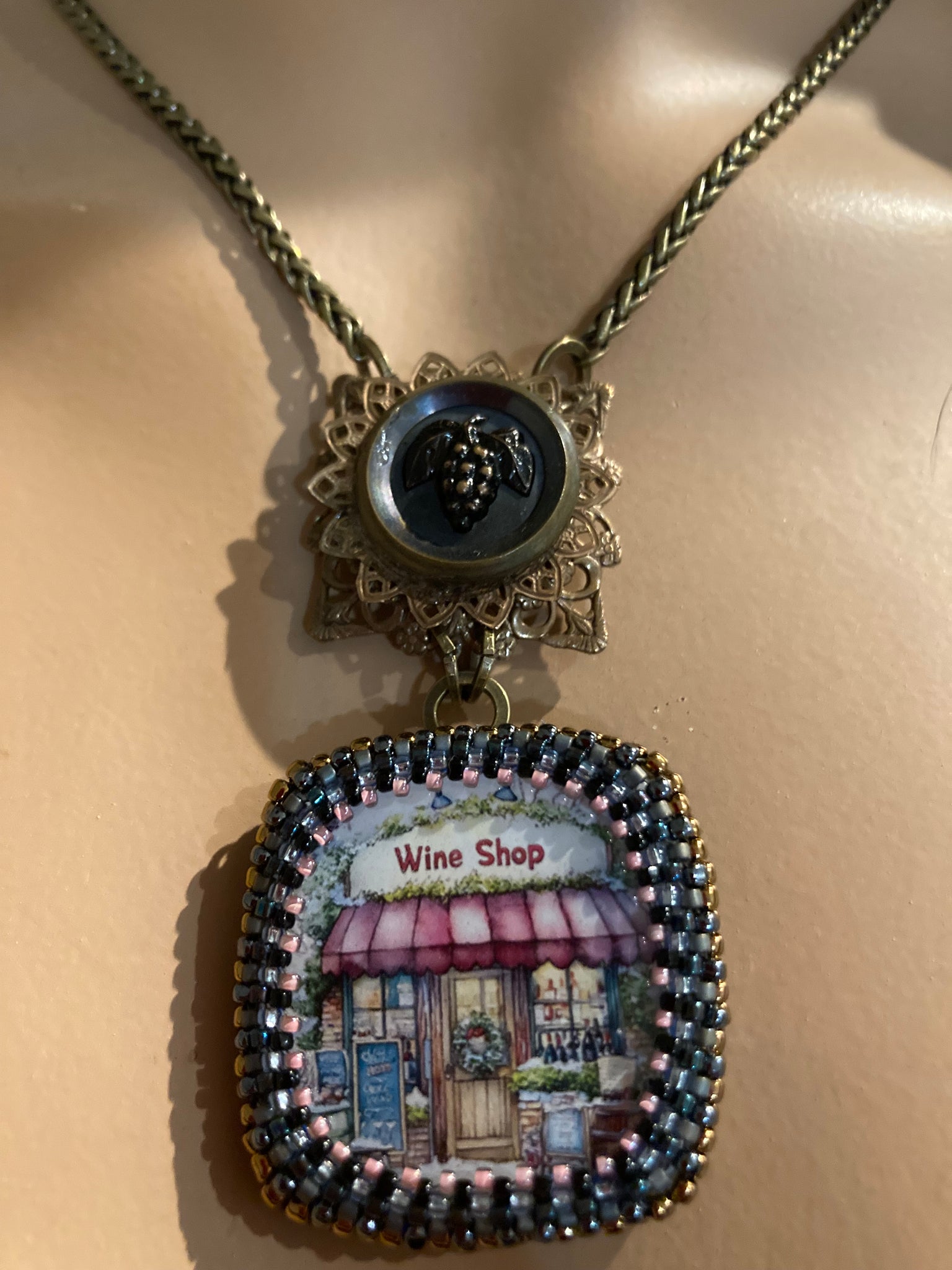 Hand beaded wine shop image is paired with rare Victorian grapes button, mounted on layered filigree. They’re suspended from a 16” antiqued brass chain with a 3” extender.