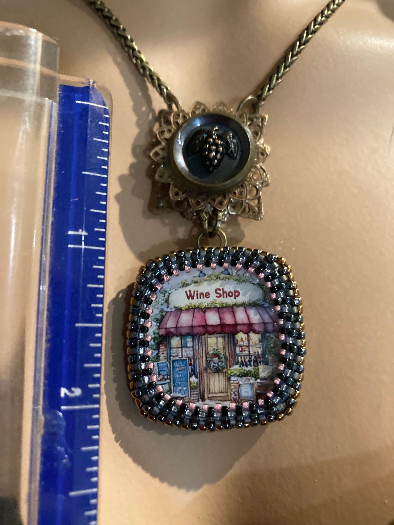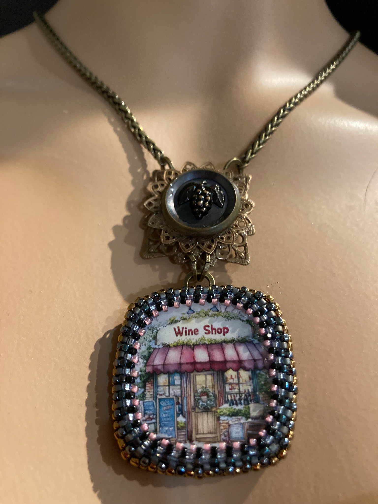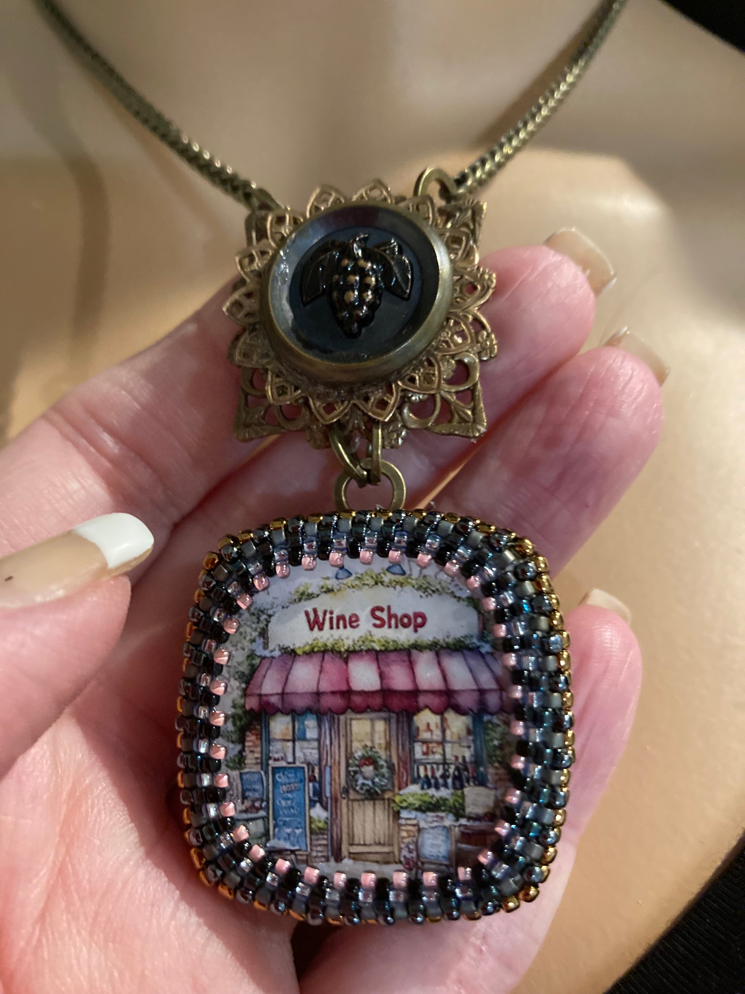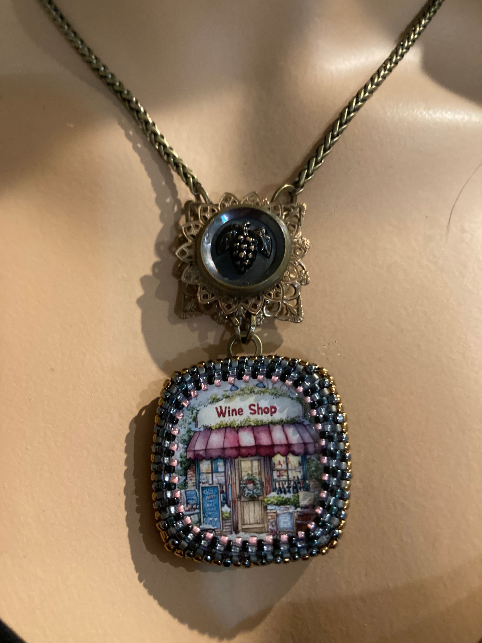 Hand beaded wine shop image is paired with rare Victorian grapes button, mounted on layered filigree. They’re suspended from a 16” antiqued brass chain with a 3” extender.