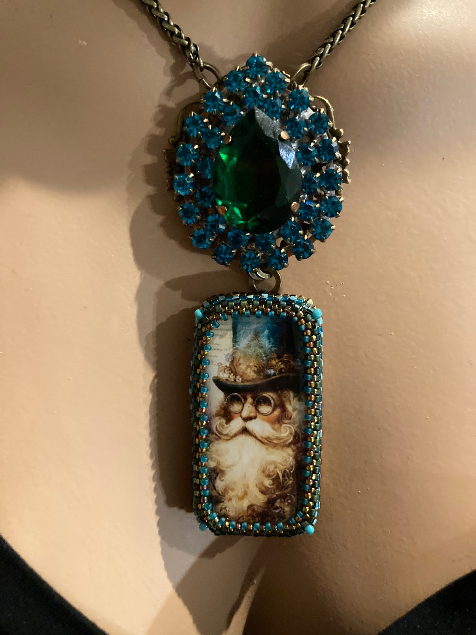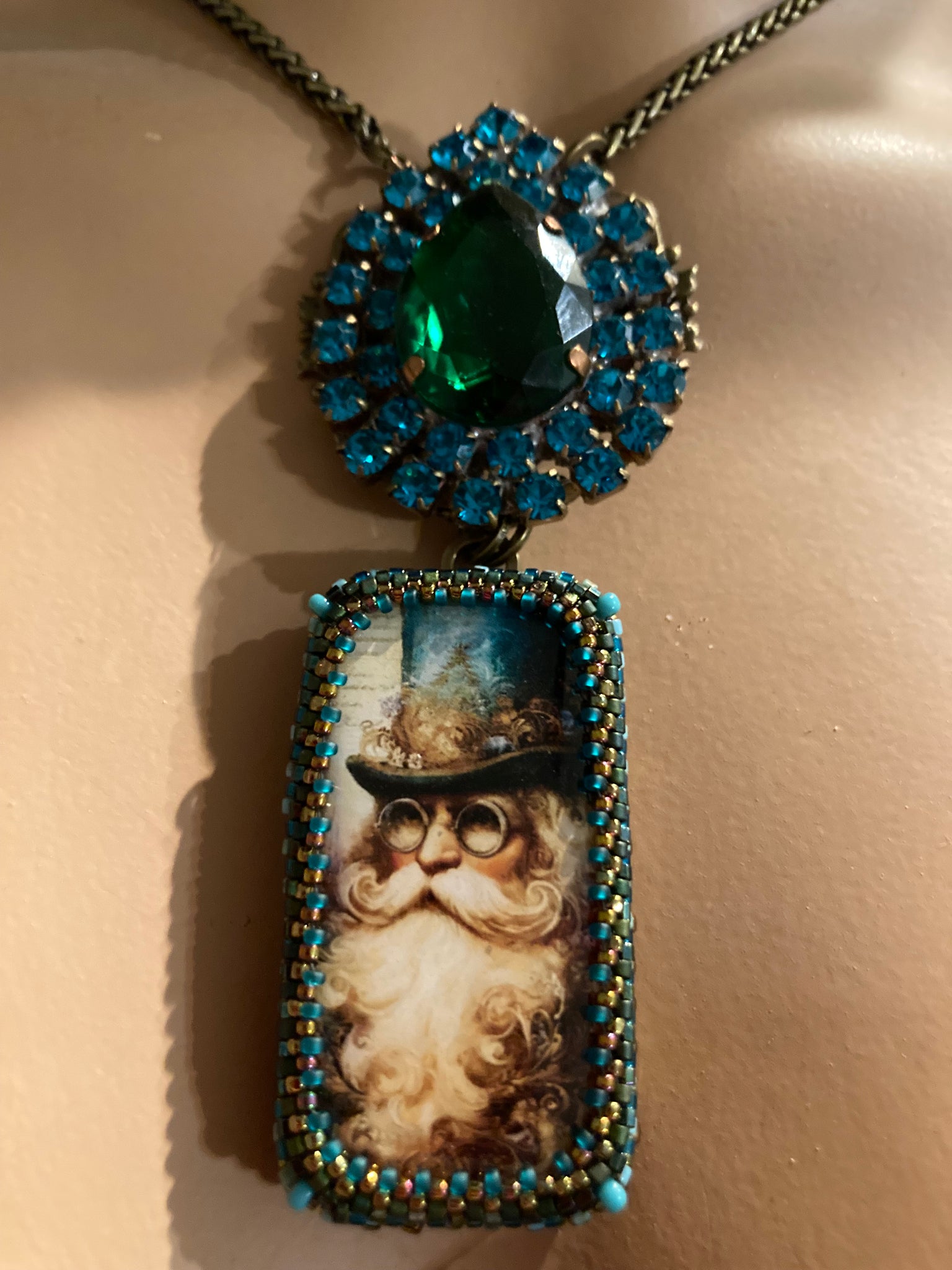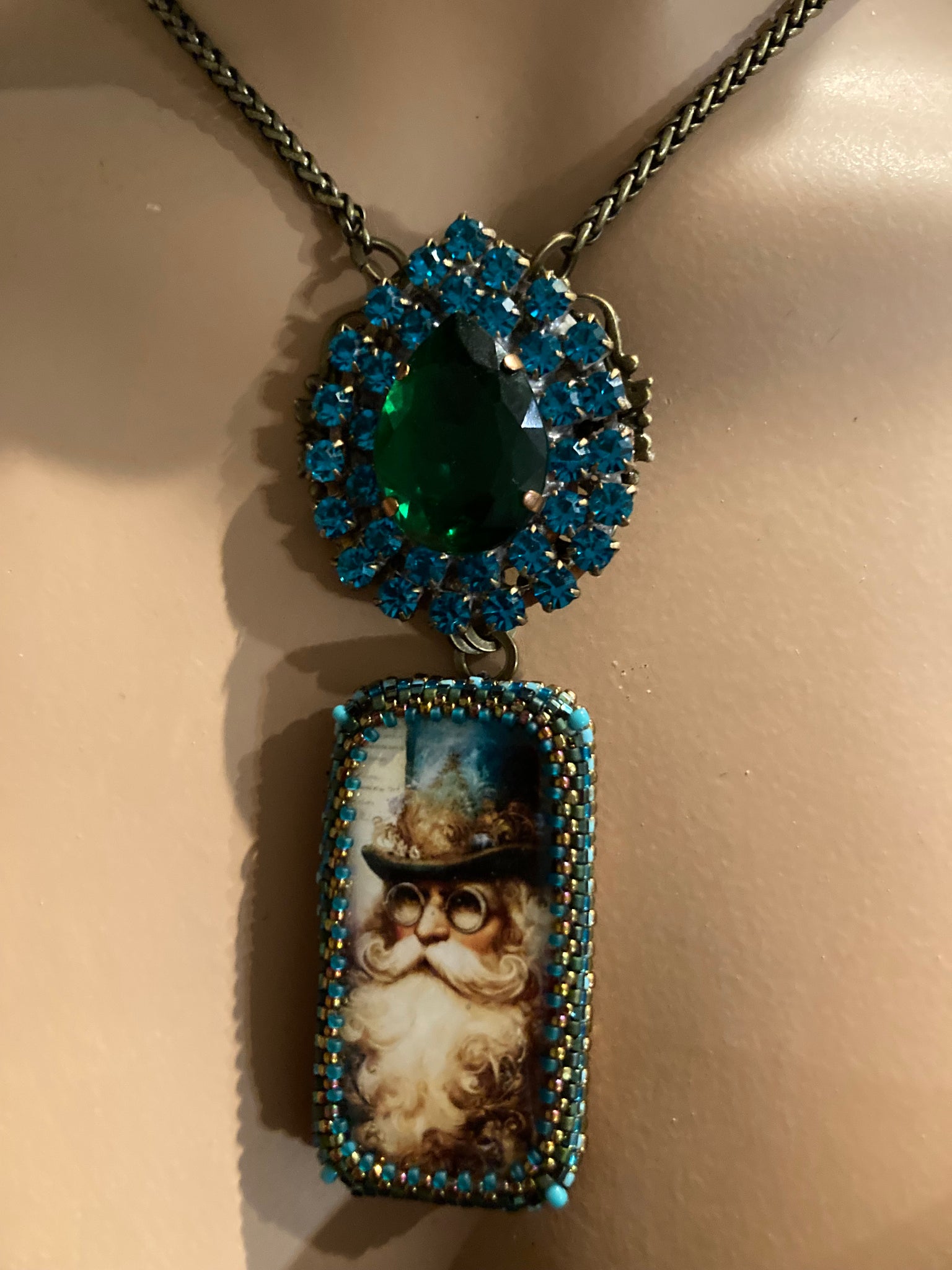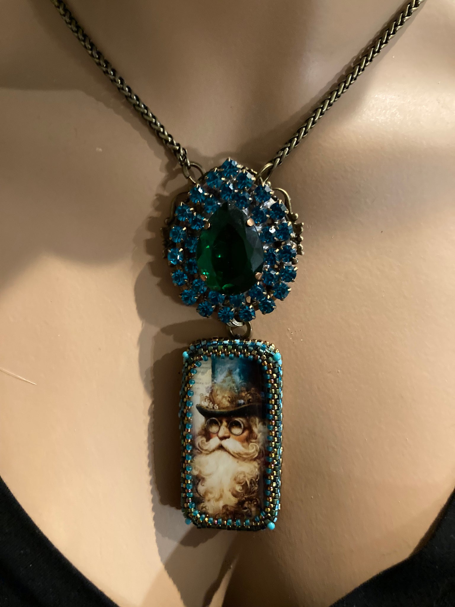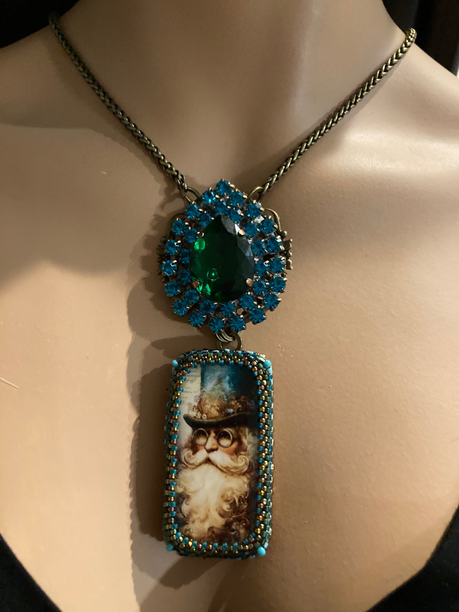 Dashing Jules Verne Santa is ready to deliver. He’s hand beaded in lush Amber, green, and teal beads and paired with yummy vintage Czech glass. All is suspended from a 16” antiqued brass chain with a 3” extender.
