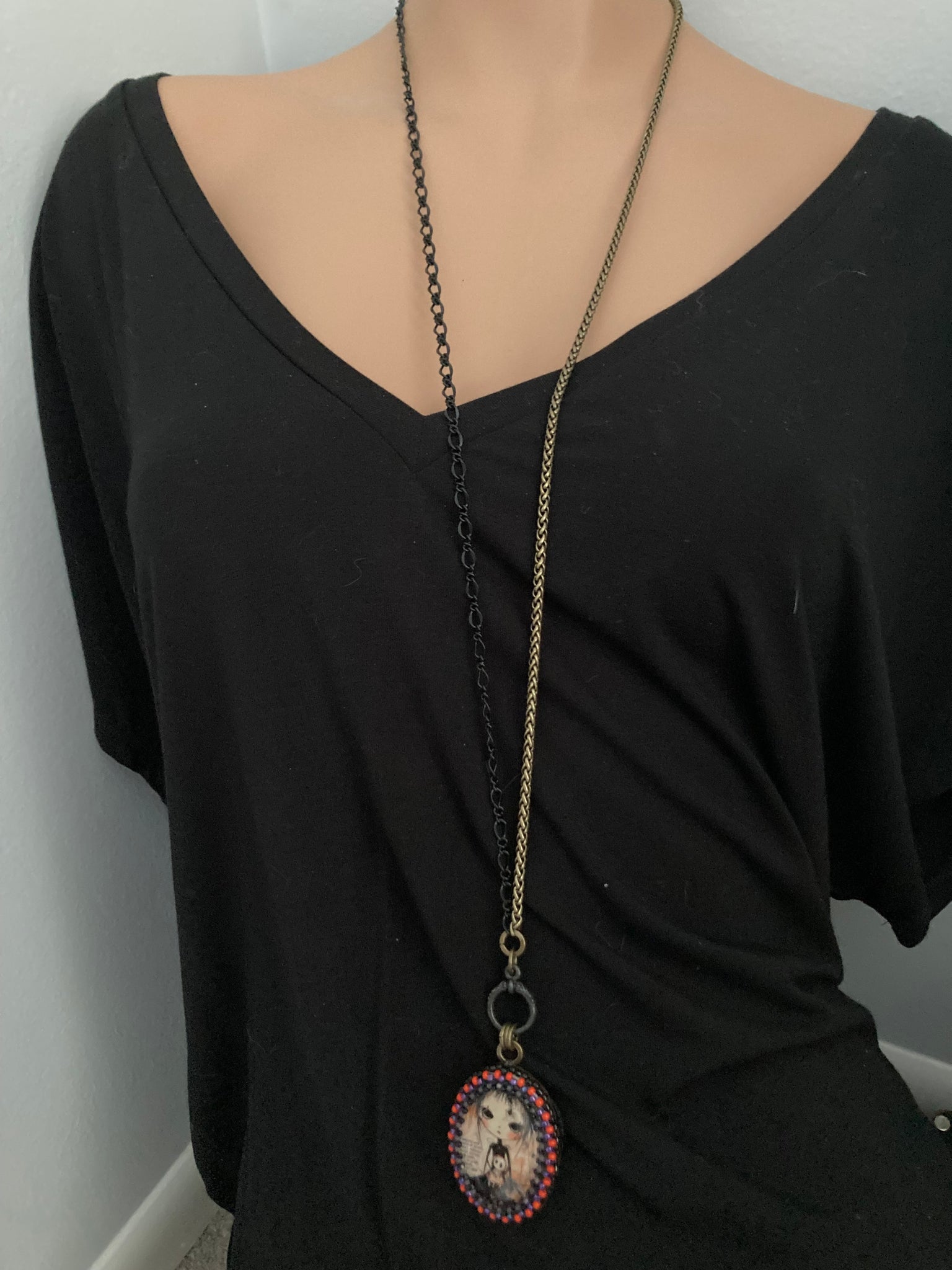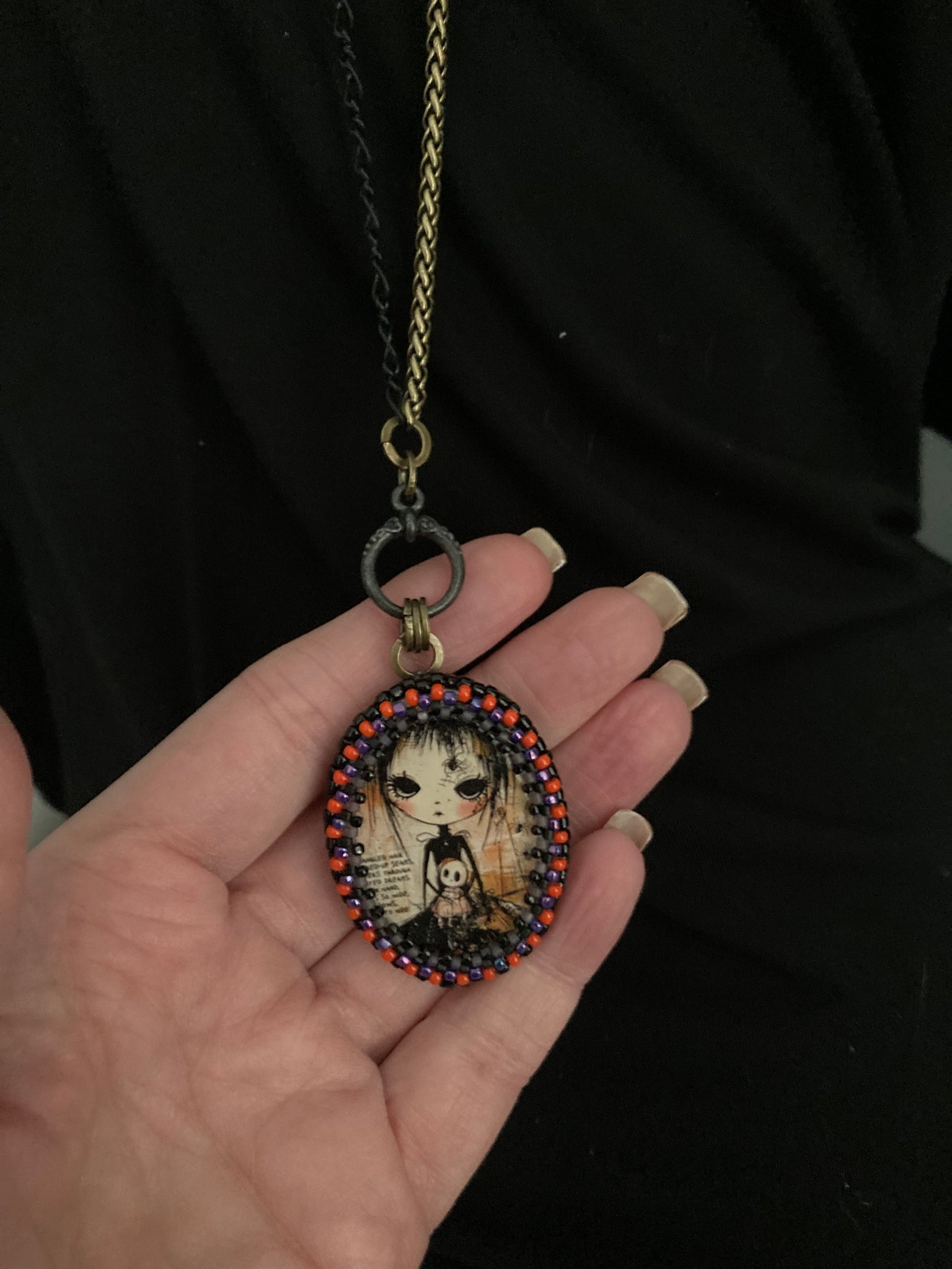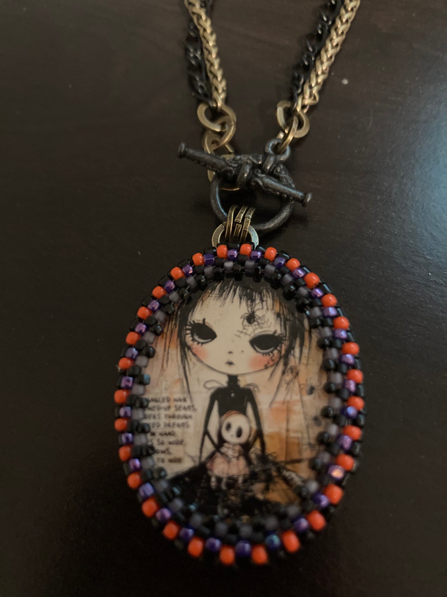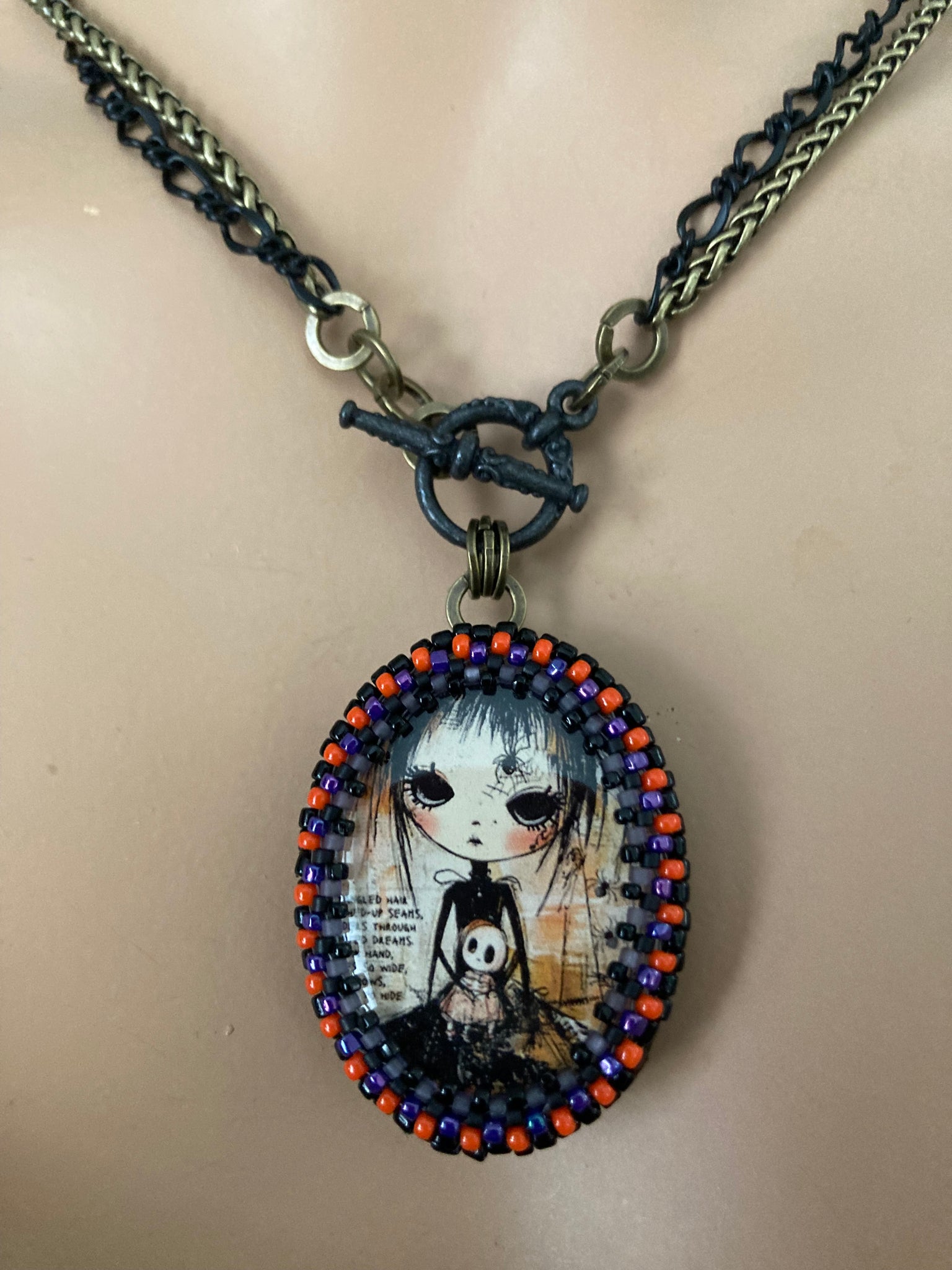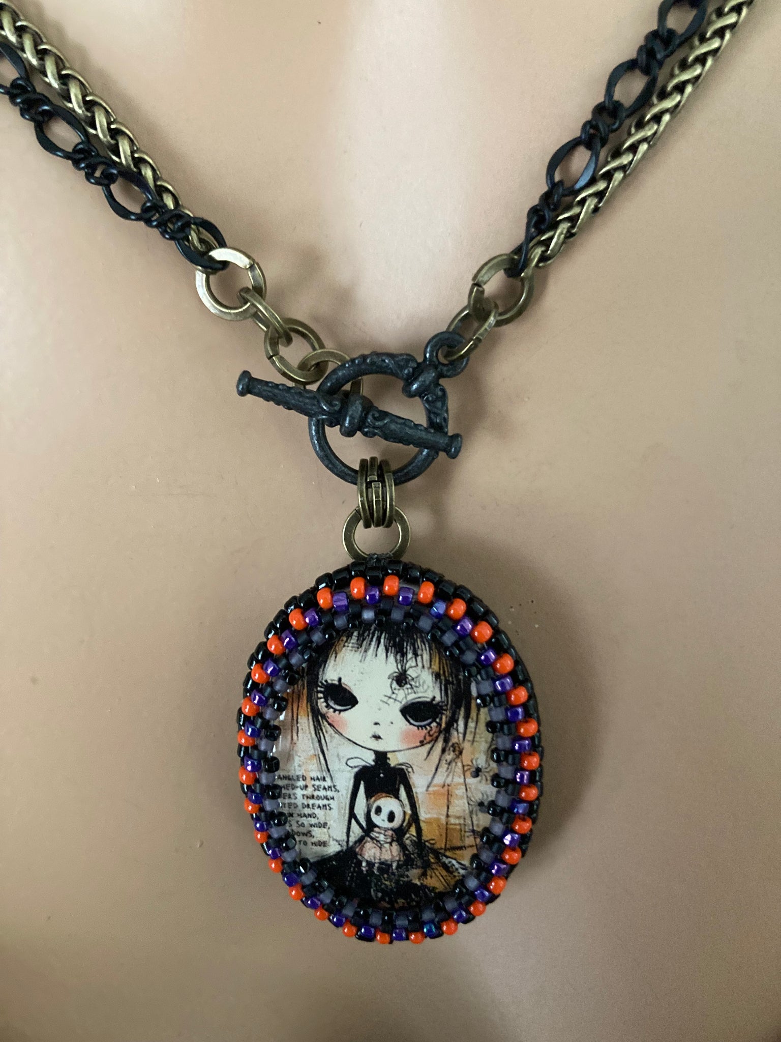 Hand beaded Winona is 1.5” X 1.25”. She’s suspended from 17” black and antiqued brass chains with a toggle closure. She can be worn short at the 17” length or long at 34”. See more the secret vintage button on the flip side.
