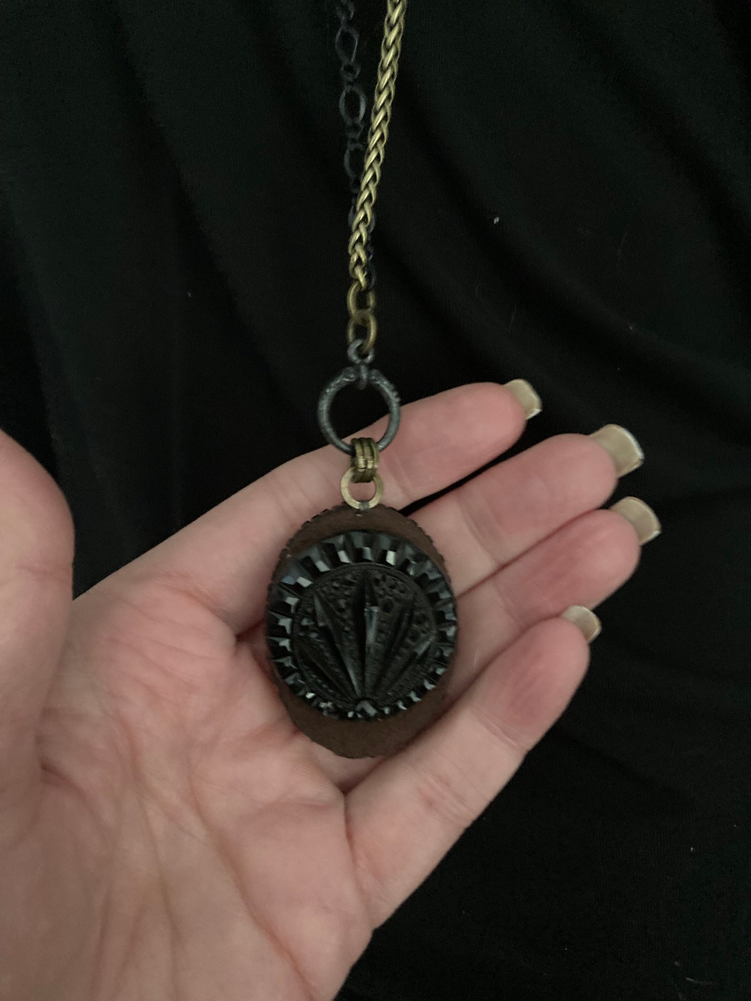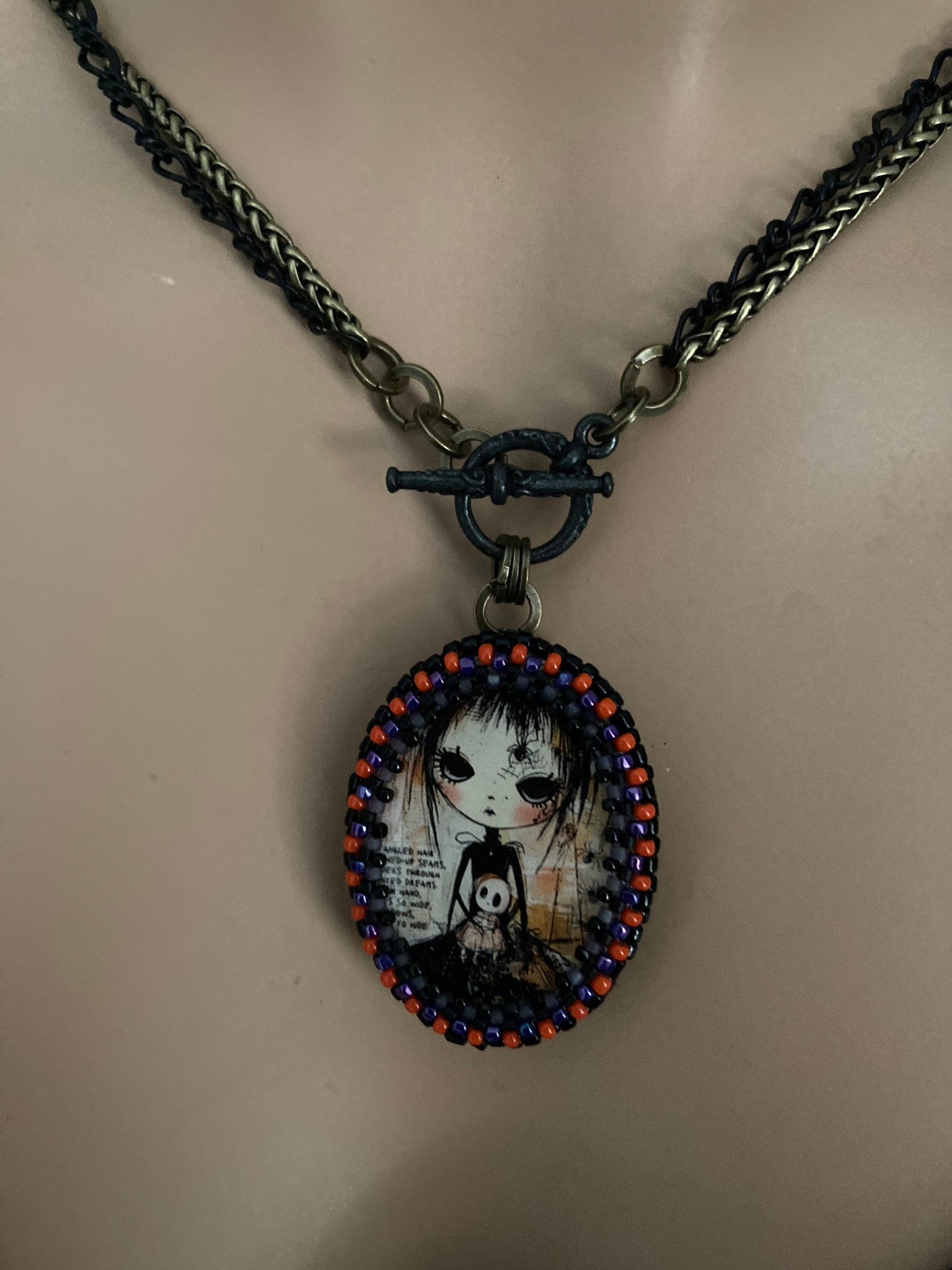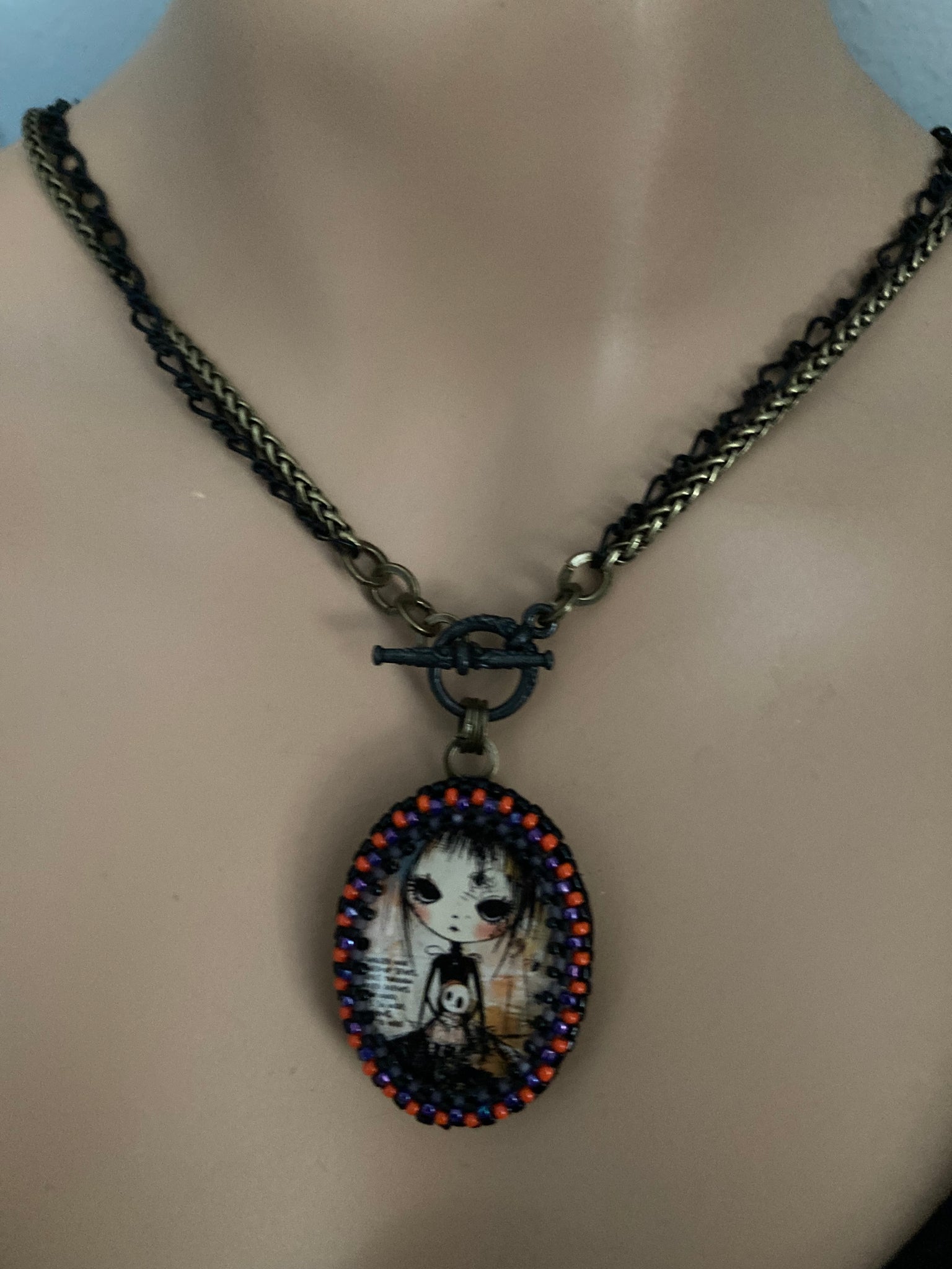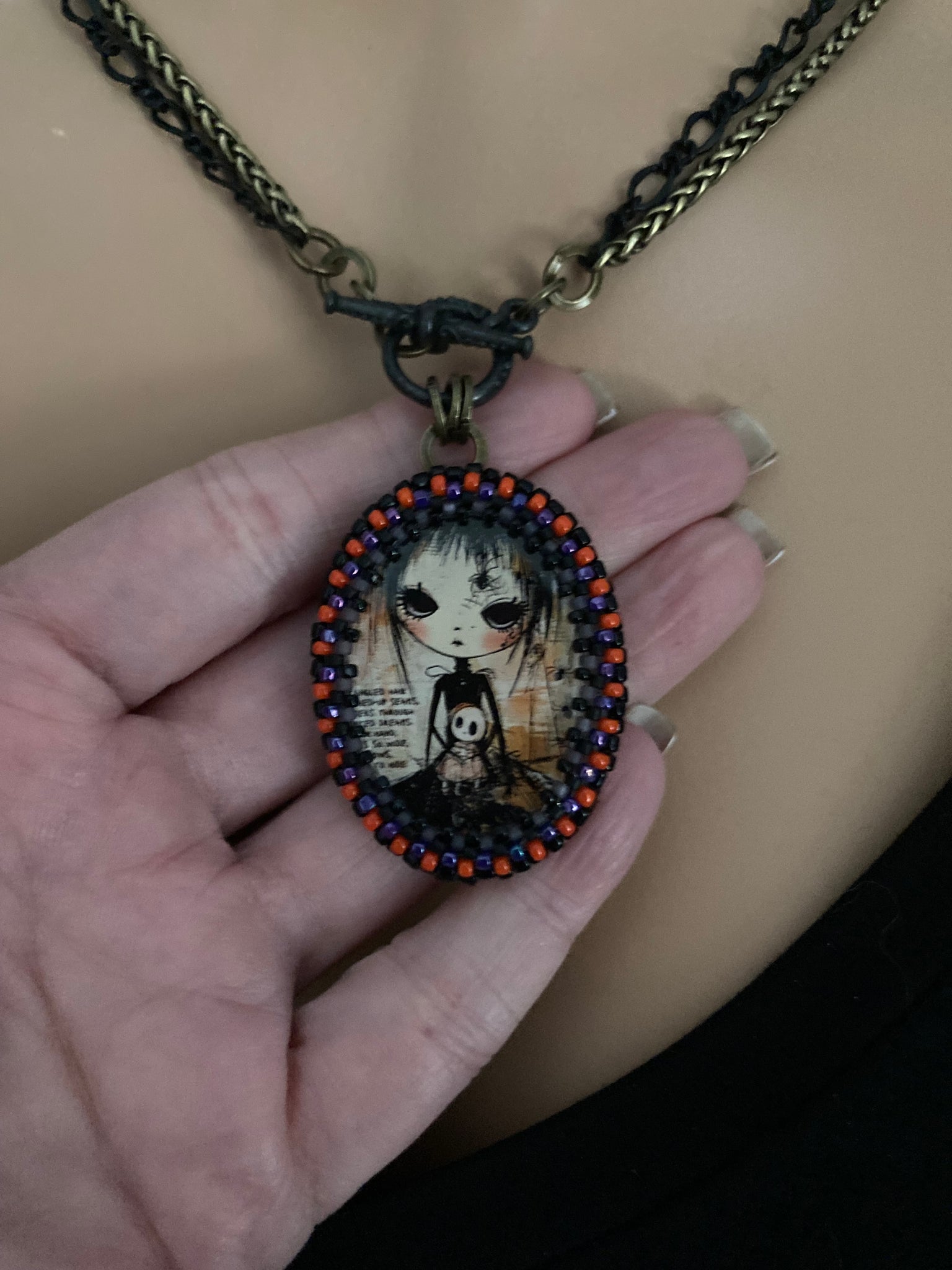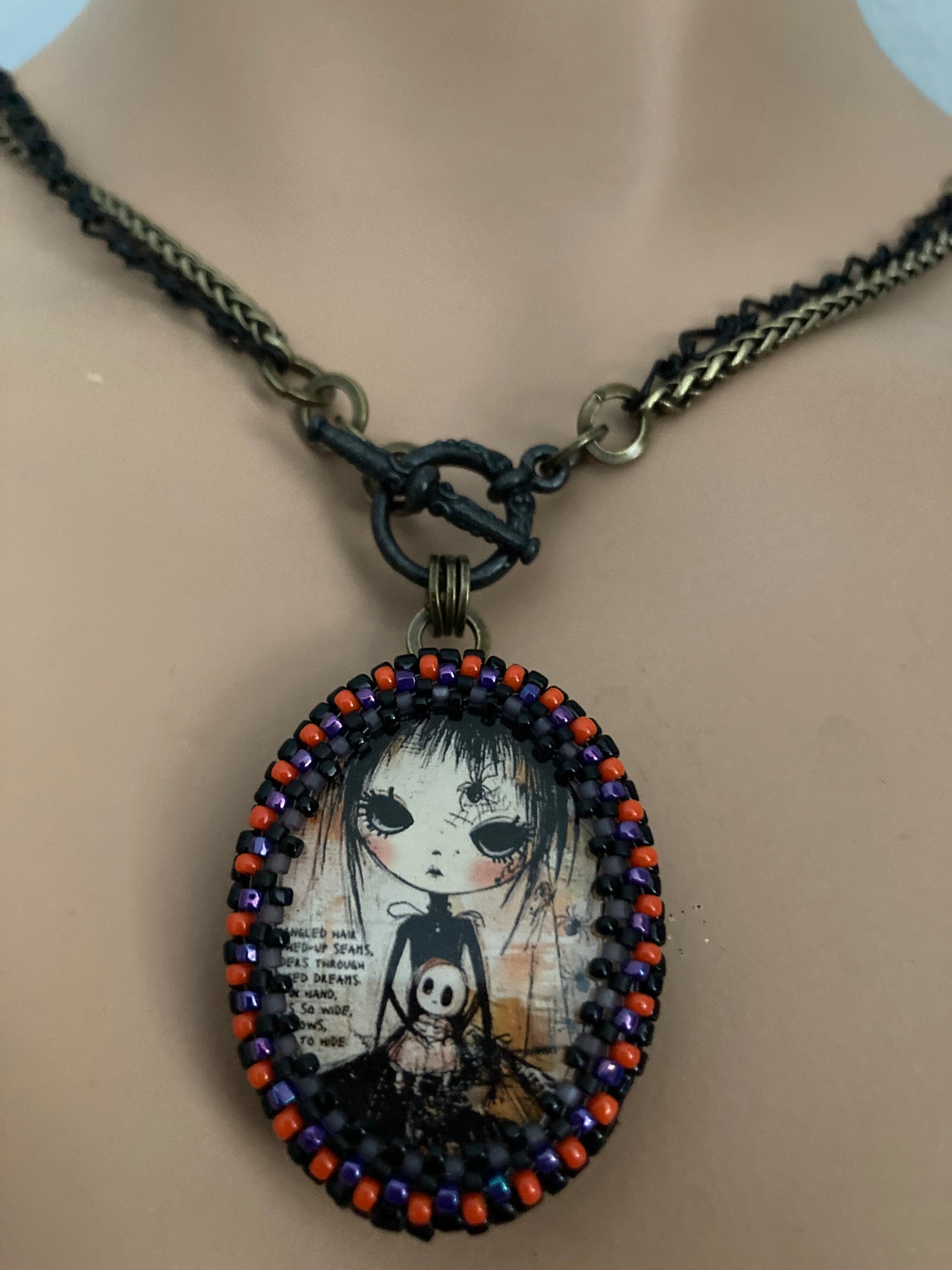 Hand beaded Winona is 1.5” X 1.25”. She’s suspended from 17” black and antiqued brass chains with a toggle closure. She can be worn short at the 17” length or long at 34”. See more the secret vintage button on the flip side.