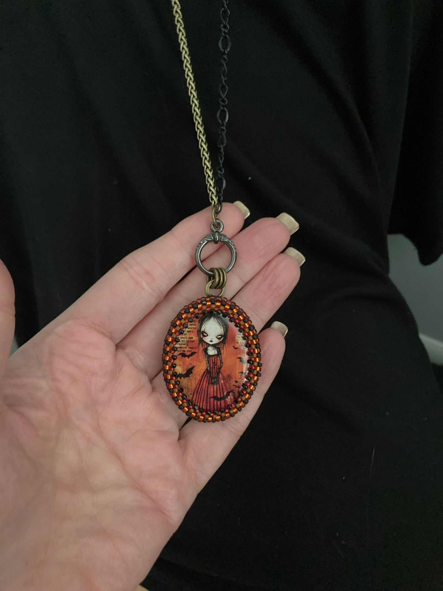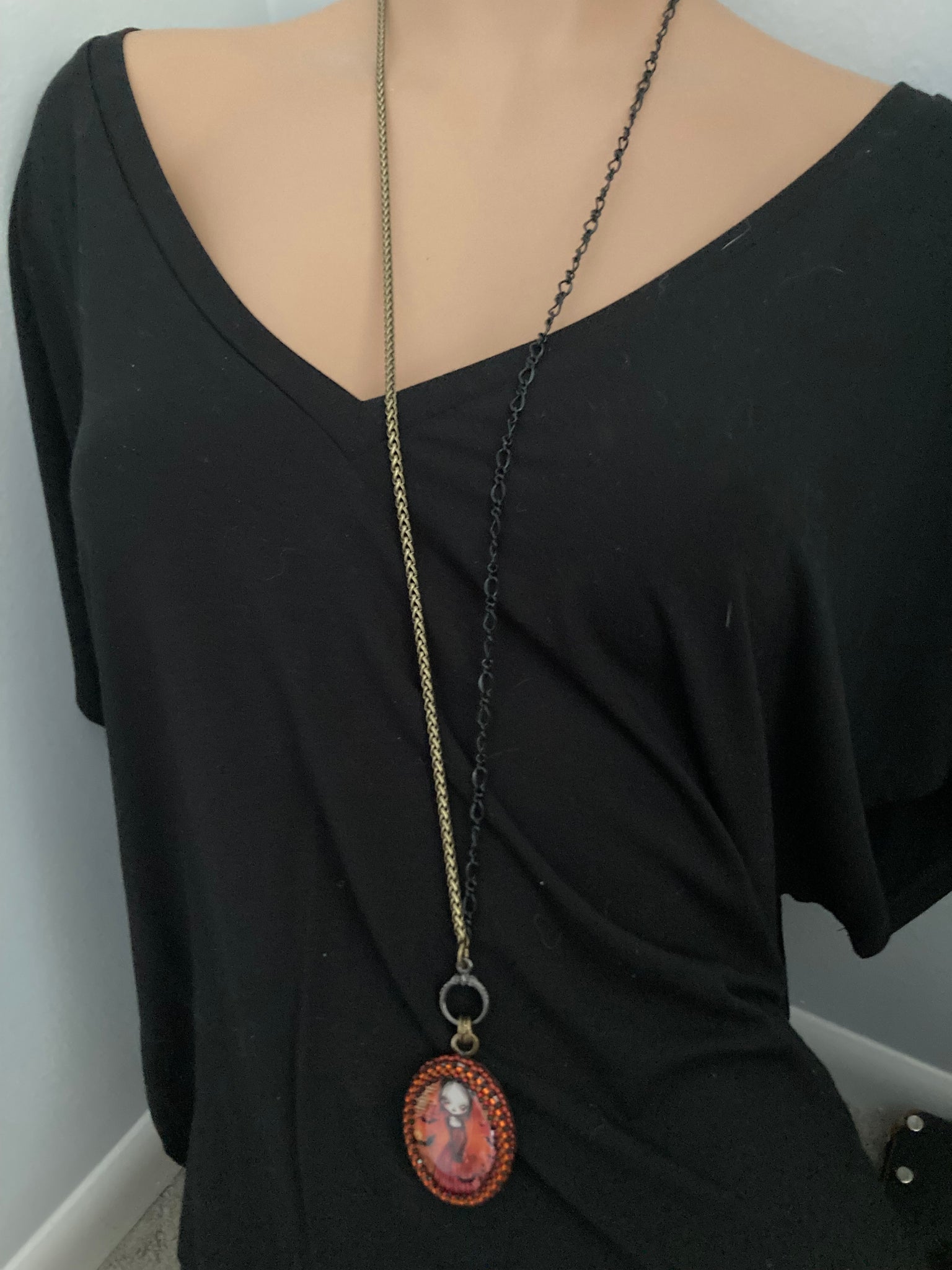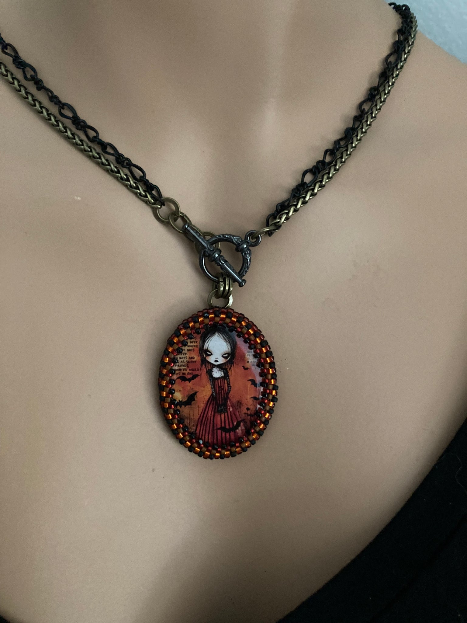 Hand beaded Morticia is 1.5” X 1.25”. She’s suspended from 17” black and antiqued brass chains with a toggle closure. She can be worn short at the 17” length or long at 34”. See the secret vintage button on the flip side.