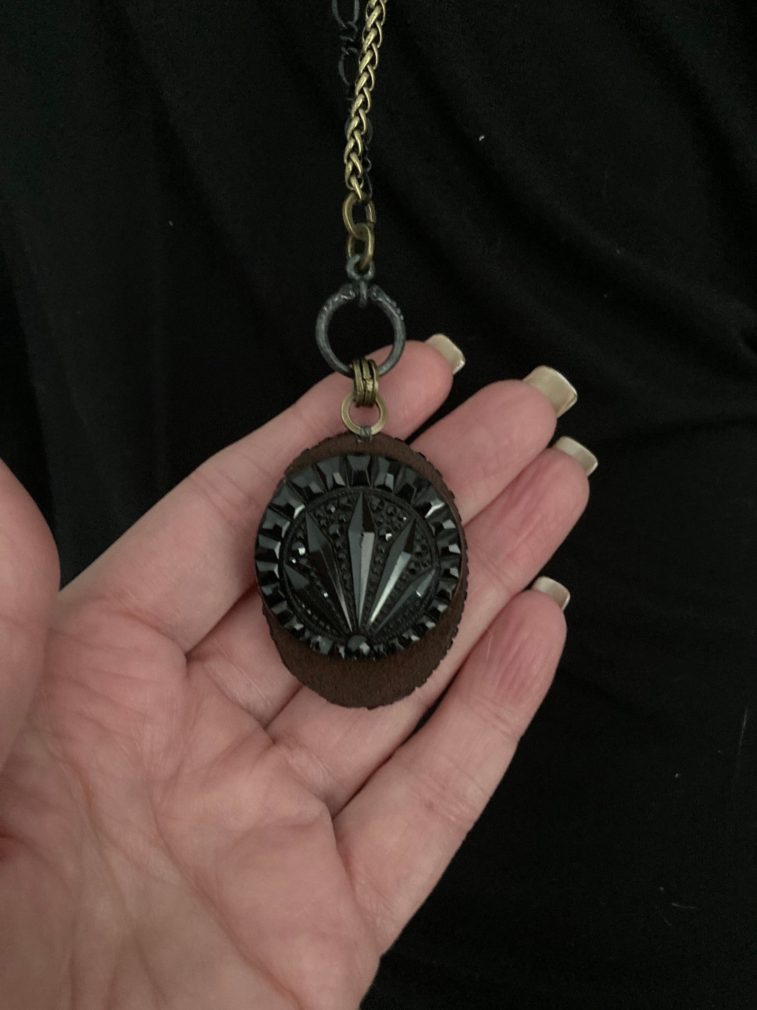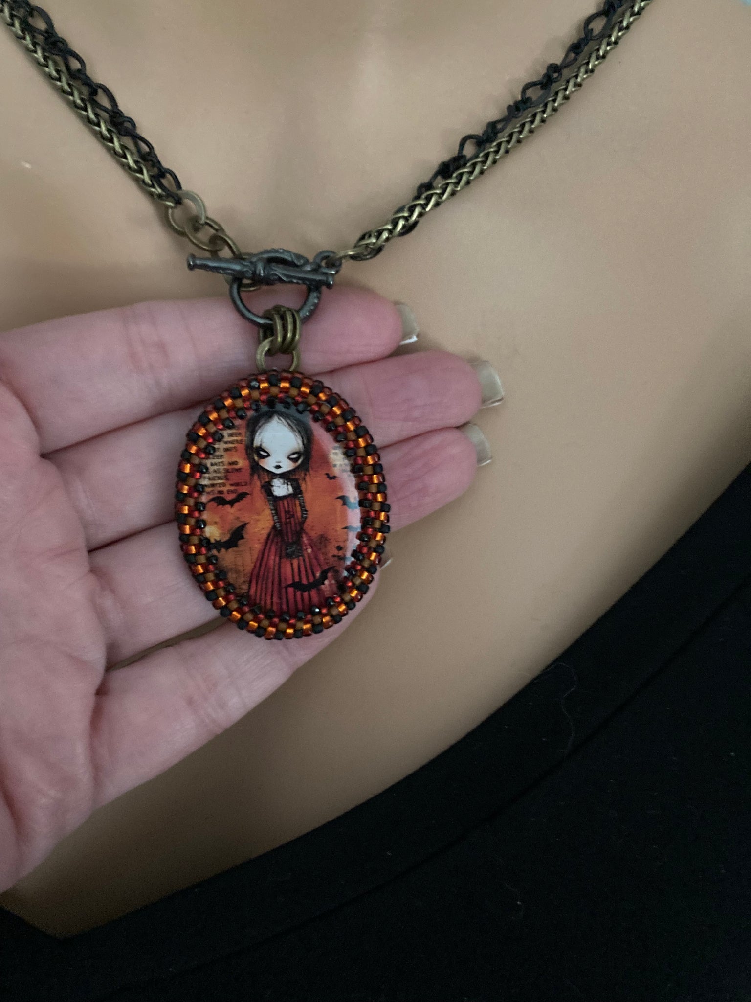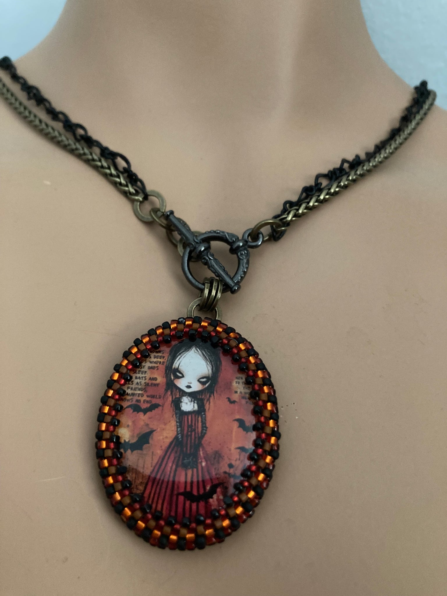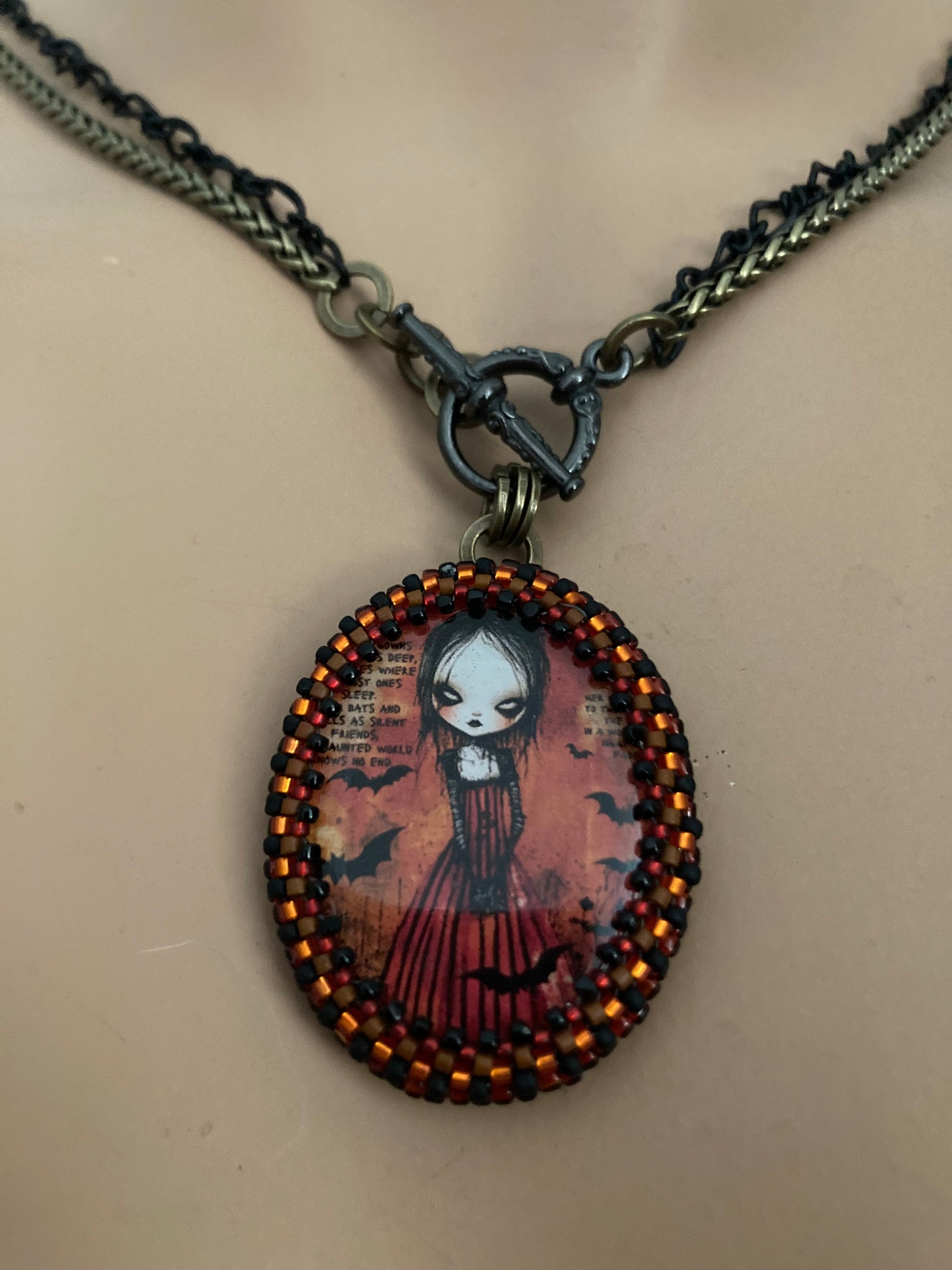 Hand beaded Morticia is 1.5” X 1.25”. She’s suspended from 17” black and antiqued brass chains with a toggle closure. She can be worn short at the 17” length or long at 34”. See the secret vintage button on the flip side.