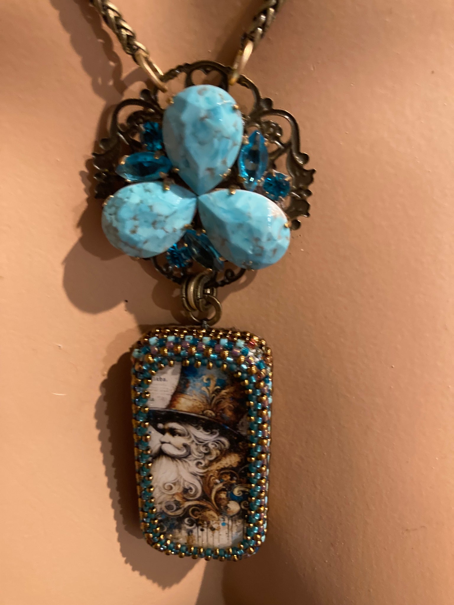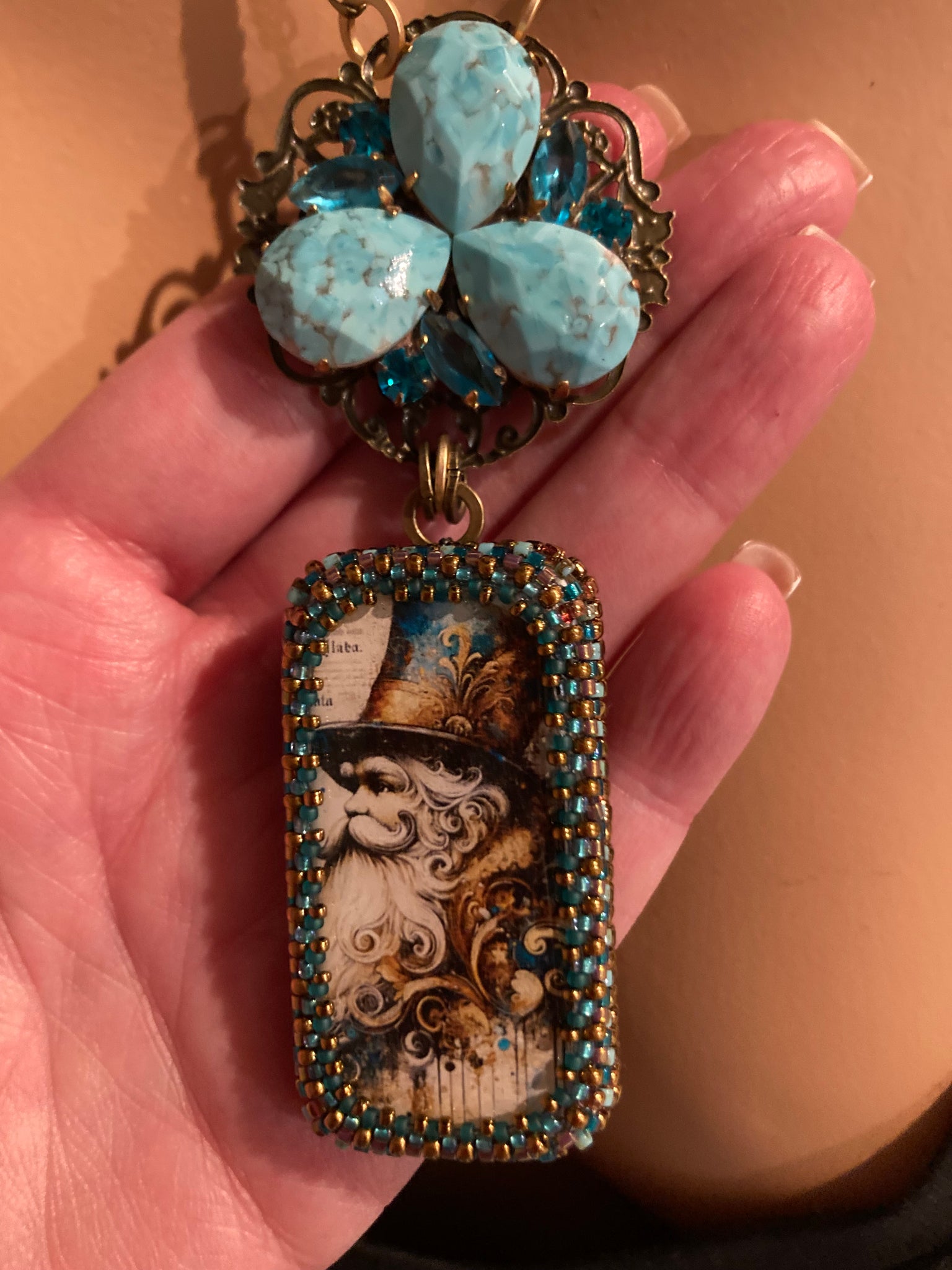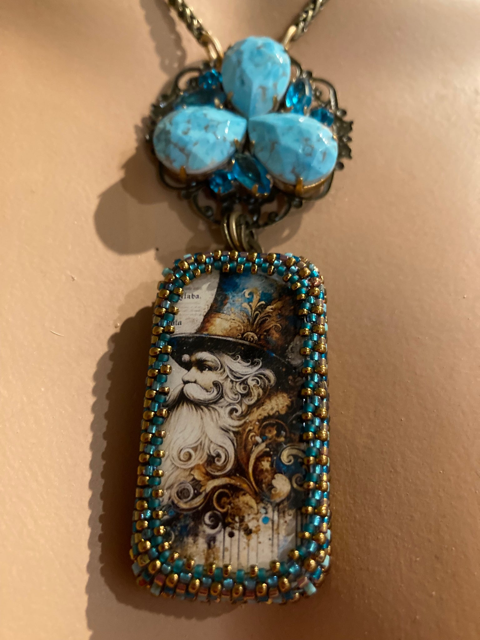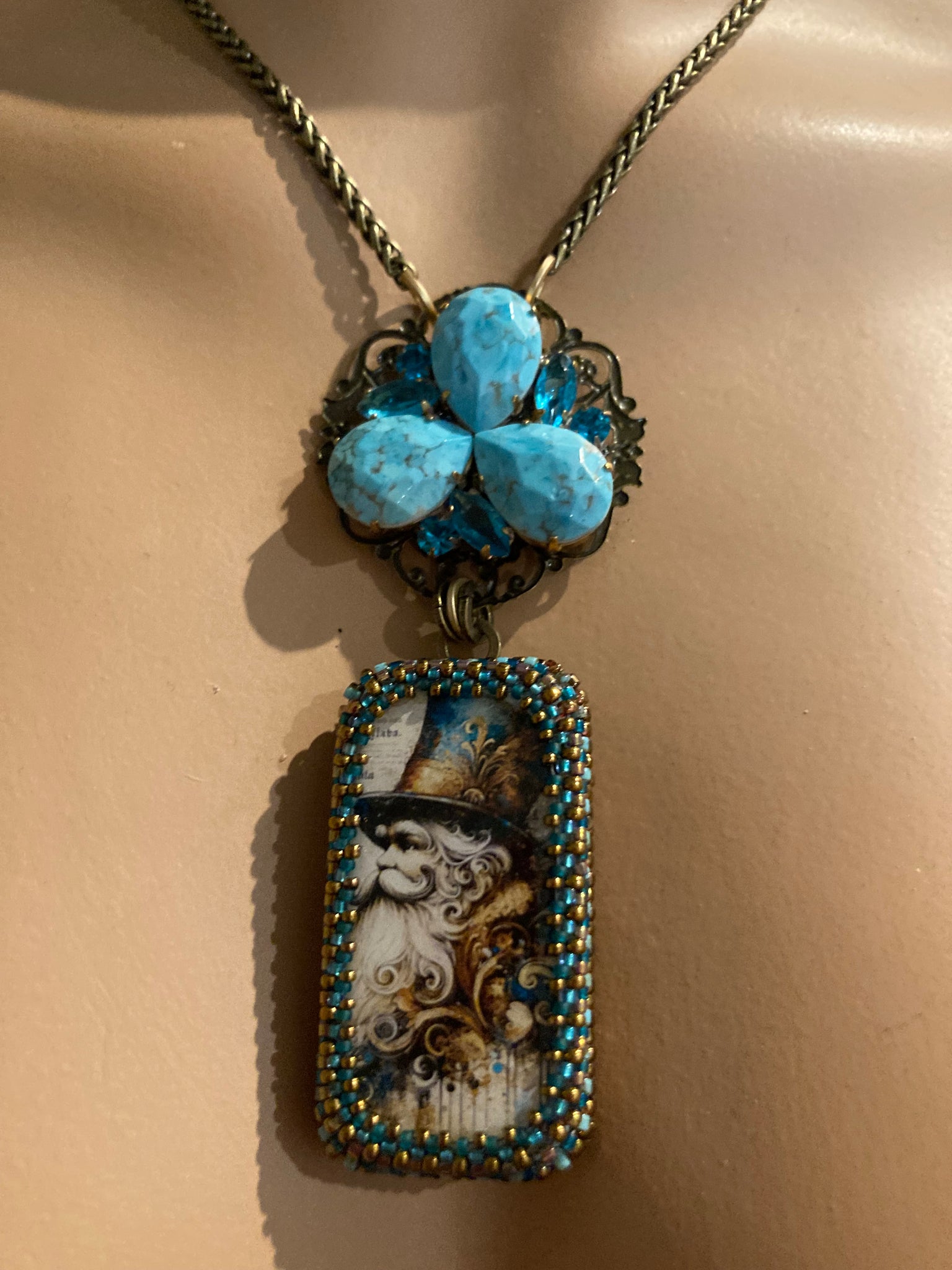 Jules Verne Santa is one of my faves due to his distinguished, Victorian look. Hand beaded in various shades of bronze, gold, and turquoise, he’s paired with a unique piece of turquoise Czech glass. They are suspended from a 16” solid brass chain with a 3” extender.