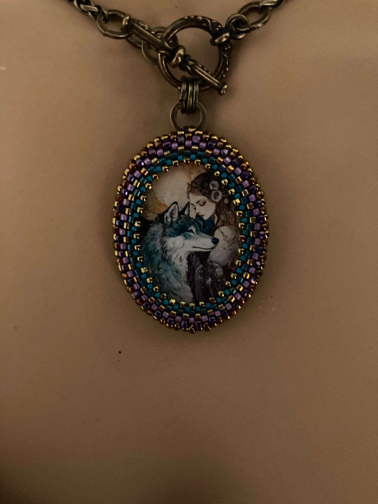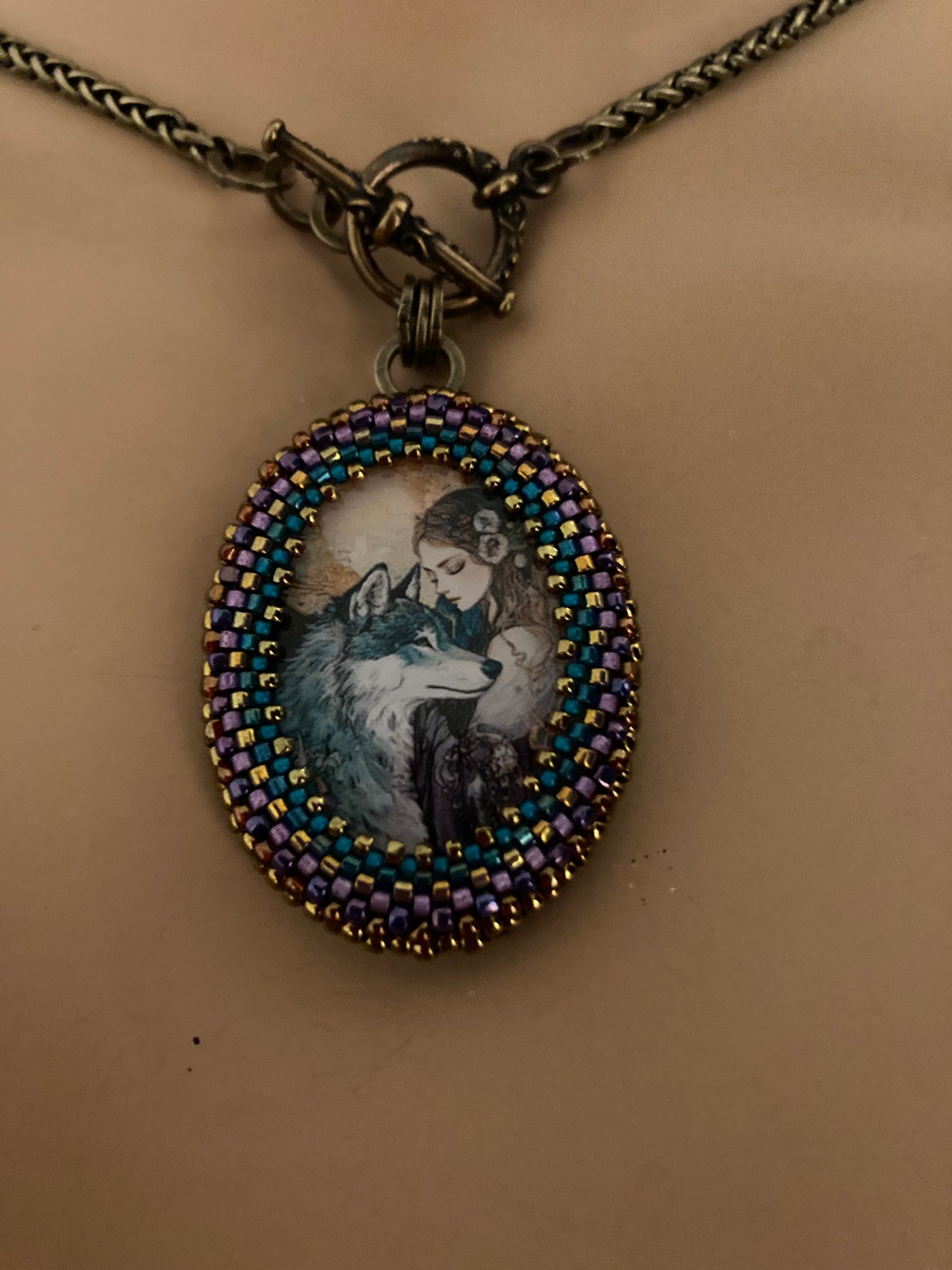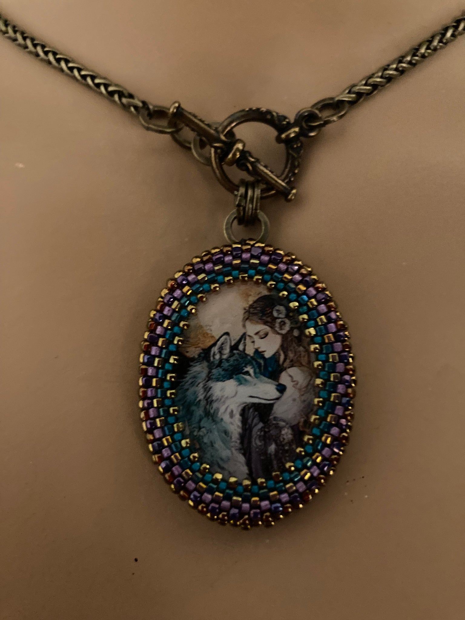 Prima is hand beaded in teals, purples and bronze and suspended from a 17” brass chain with a front toggle closure.