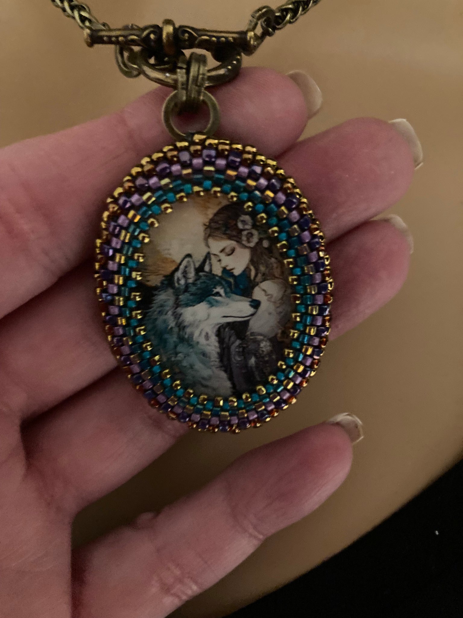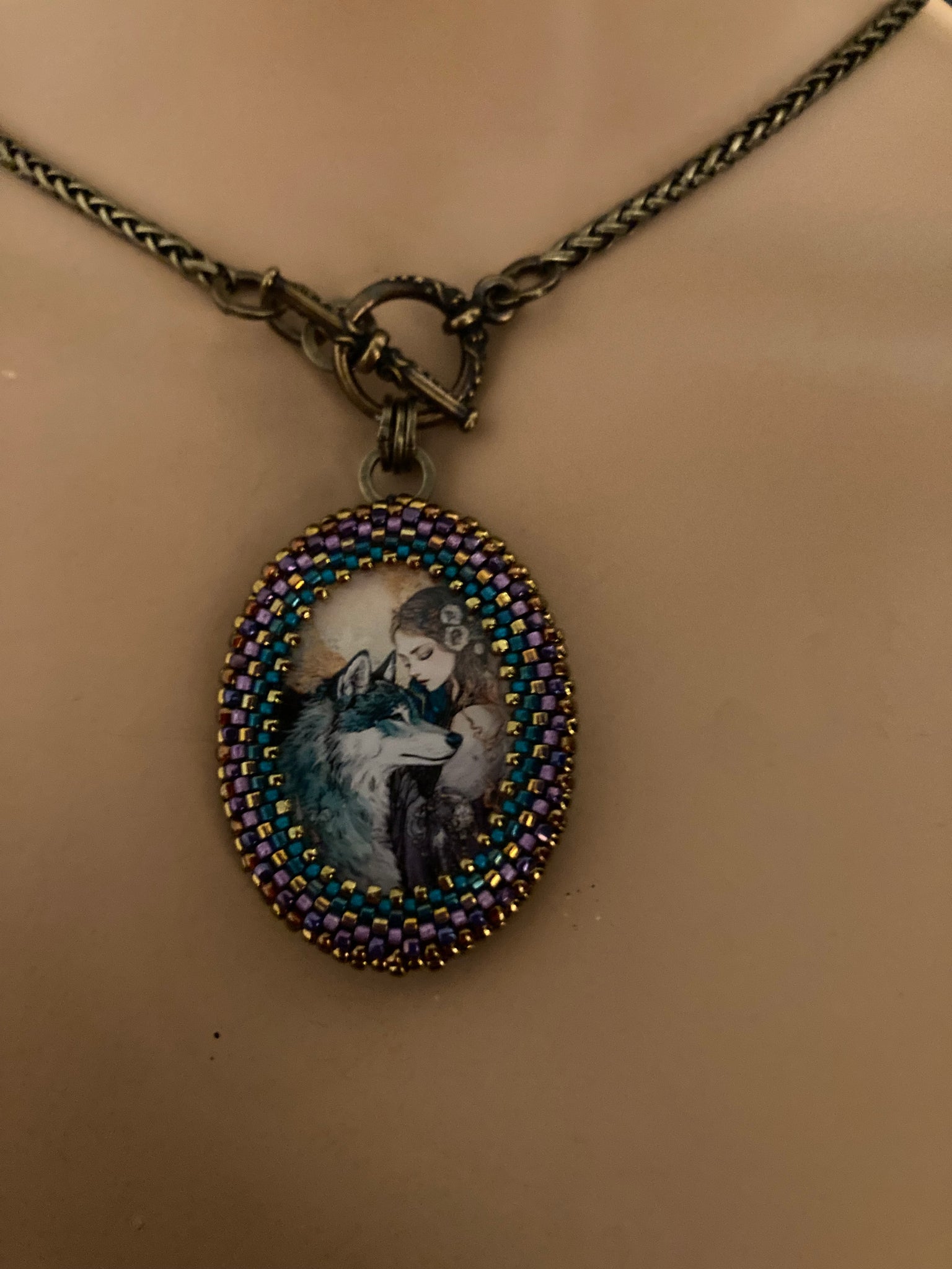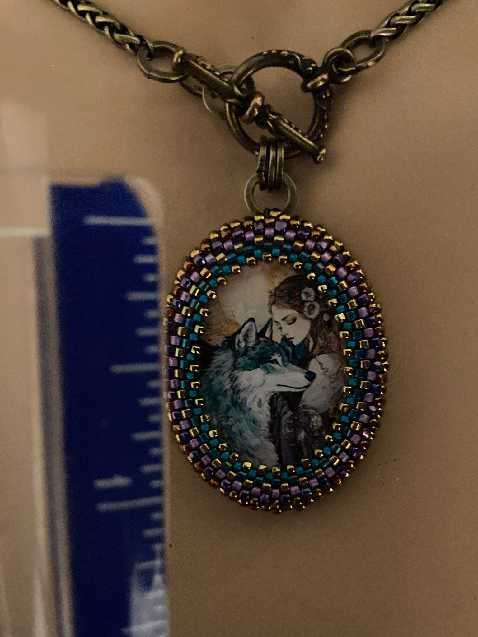 Prima is hand beaded in teals, purples and bronze and suspended from a 17” brass chain with a front toggle closure.